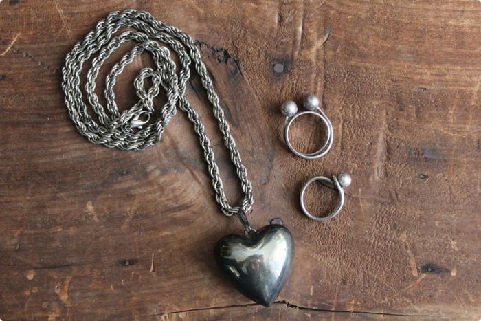 | 1970s oversized heart necklace | 1970s sterling modernist ball ring | 1970s sterling modernist double-ball ring |